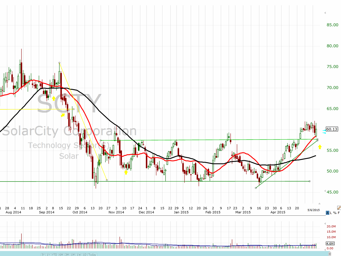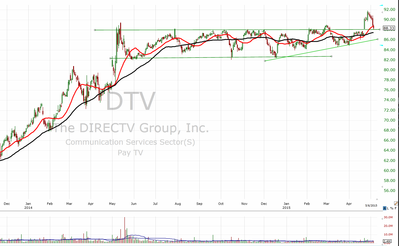 DirecTv (DTV) and Solar City (SCTY) are two stocks that have been basing for a long time.  DTV traded between roughly between $83-$88 for 1 year, SCTY traded between $47.75-$57.50 for 7 months.  Both stocks are trading above their respective bases.