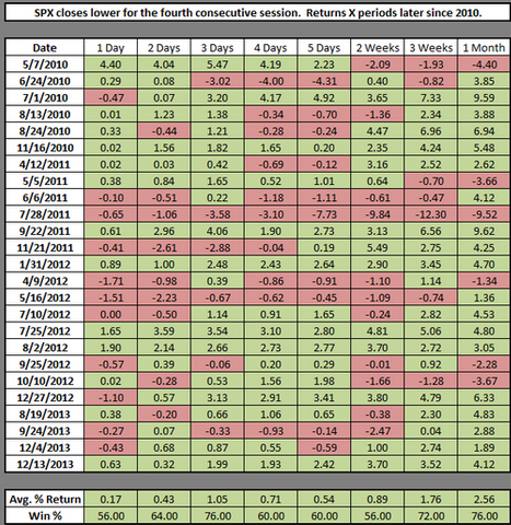 chart of the outcome of the SP500 after 4 consecutive down closes.