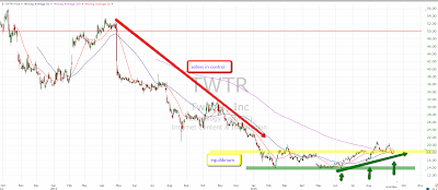 The buyers are now taking control, you can see that by the pattern of higher lows that started in June, they weeded out the big sellers and you can argue that the stock has a brand new set of stockholders. Twitter right now is sitting on top of its 8-month base and bouncing off it. The stock looks promising here at these levels and move to $24 is not out of the question. A break of the $17.50 level would take this stock back to the bench.