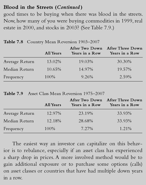 Recent data by Dimson, Marsh, Staunton database showed a median country returns of 8.74% (all years) and 15.94% after 3 down years in a row, both suggest that you will double the median return of all years if you own a country etf that is down 3 years in a row.  It’s a very rare occasion that only happens 3% of the time.