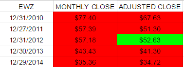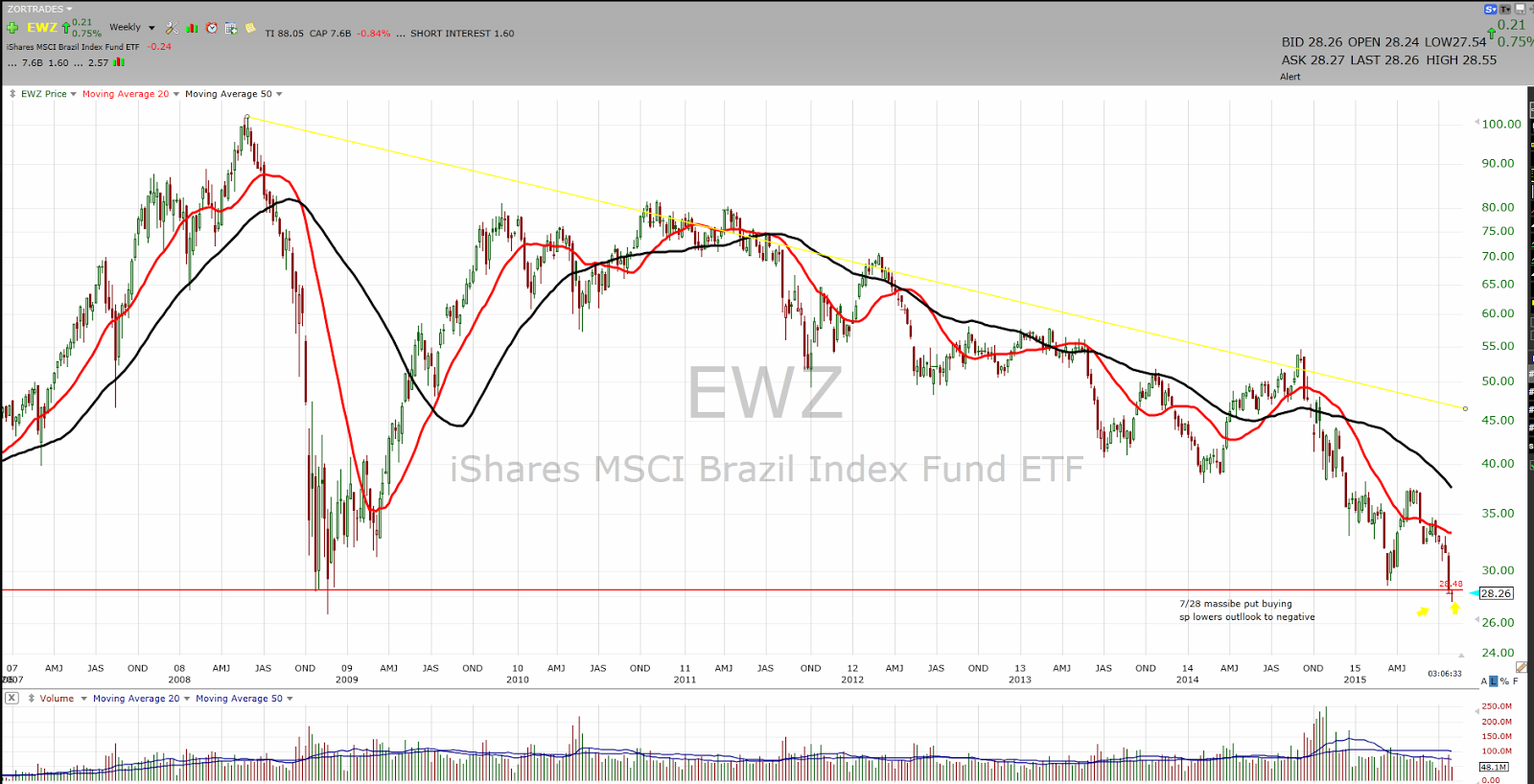Currently Brazil $EWZ is down multiple years in a row and is the only candidate right now to possibly double the median country return.  I bring this up now because recently there has been massive put buying in $EWZ and just today Standard and Poors lowered their rating on Brazil to a negative.  The ETF responds by bouncing from the 2008 lows, printing a hammer on the daily chart, and possibly a failed breakdown on the weekly chart, all which I believe has bullish implications in the short term.