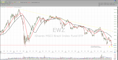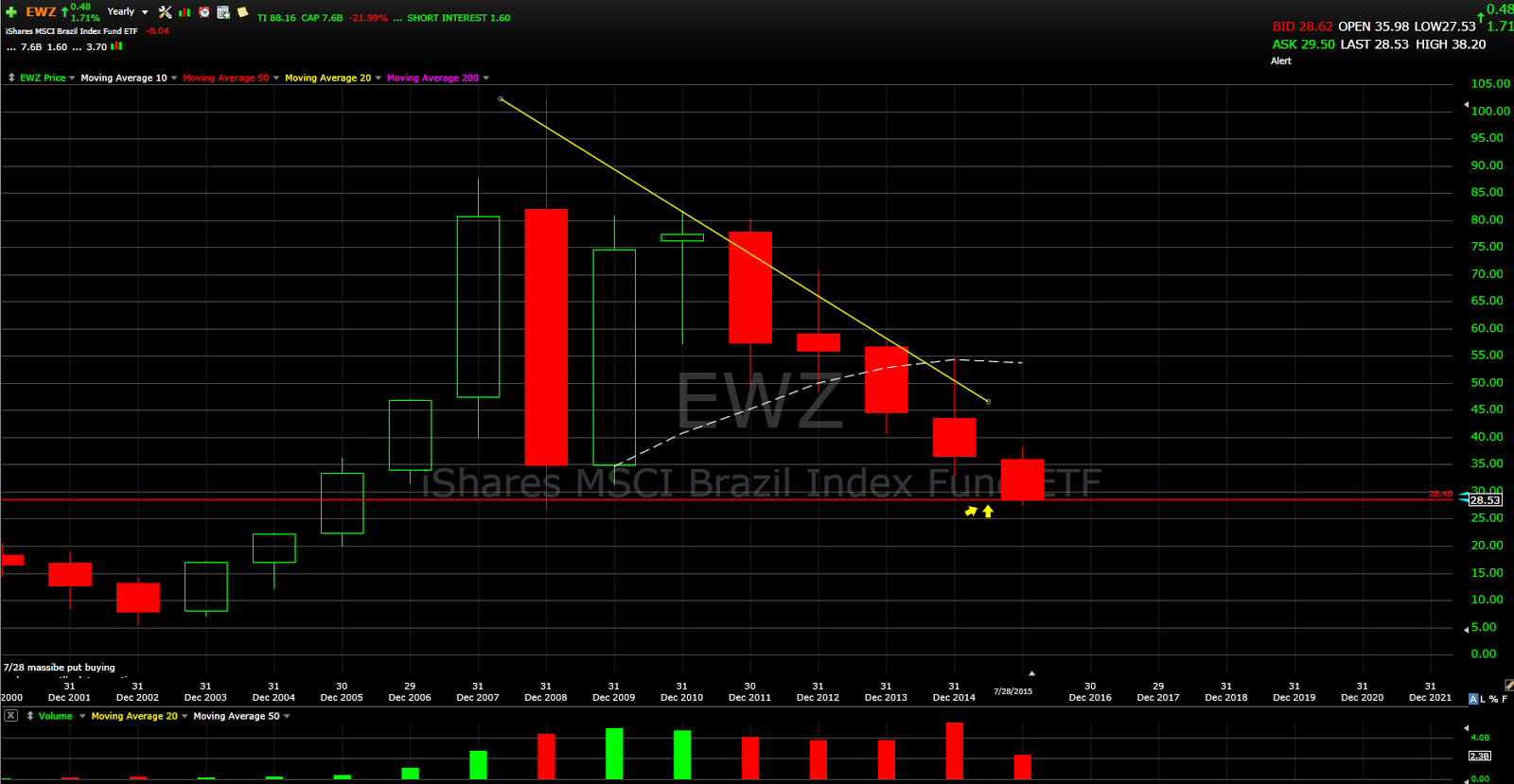 With $EWZ down 47.76% from its 52 week high, 20% below its 200 day moving average, down 13.78% in the last month, -22.58% in the last 3 months, and 61% in the last 5 years.  If time is on your side and you have the stomach for it you may want to consider this ETF.  I’m sure it won’t be an easy ride.