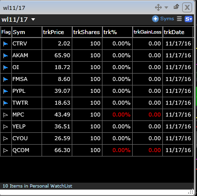 CTRV, AKAM, OI, FMSA, PYPL, TWTR, MPC, YELP , CYOU, QCOM, are the names on my long watchlist today. These stocks are actionable to me if and only if they go through yesterday’s high.