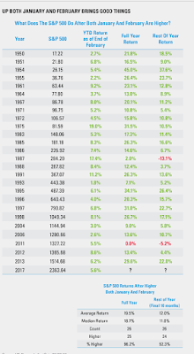 The reason why he is highlighting only the years in which the market was up January and February is that historically when January and February are up months the market does very well for the entire year. Since 1950 when the SP500 was higher the first two months 26 times, 24 of those times it was higher by year end. Here’s the research by Ryan Detrick.
