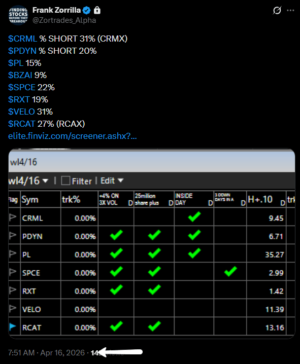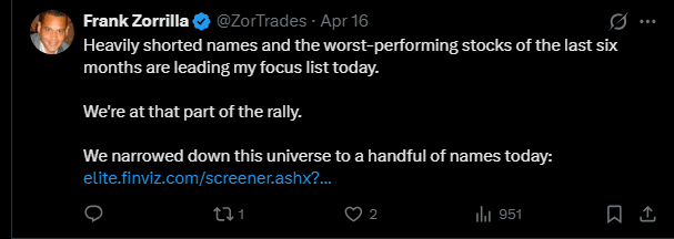 I just kept it simple: I went to Finviz, screened for stocks that are heavily shorted, 15% or more, put the list together, and executed.