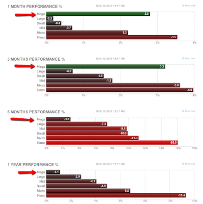 The image below tells you the whole story. The mega-cap names that have a larger effect on the SP500 have outperformed their little brothers on a 1, 3, 6, and 12-month basis. The lower cap names are all lower in every time-frame.
