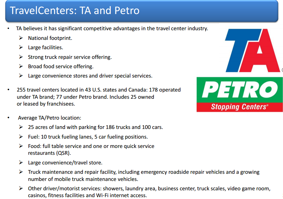 TravelCenters has been in business for over 40 years; their business includes 255 truck stops, 233 convenience stores and 52 standalone restaurants across 43 states.