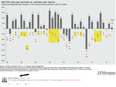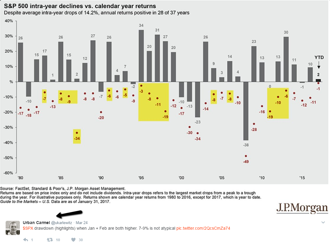 The great Urban Carmel from Fat-Pitch.blogspot.com pointed out that the average intra-year decline when the SP500 has been positive January and February is roughly -7 to -9%.