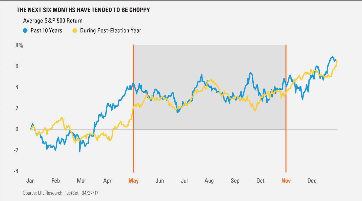 Here’s the SP500 average return in the past 10-years and during post-election year; peak in May, low in June, retest in the fall. This could be used as a guideline.