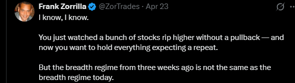 The most important development this week was the first breadth flip since 3/31. The breadth figures I track — the ones that dictate my short-term swing trading approach — closed below the 5-day moving average. This is the first arrow across the bow that says hey, slow down a little.