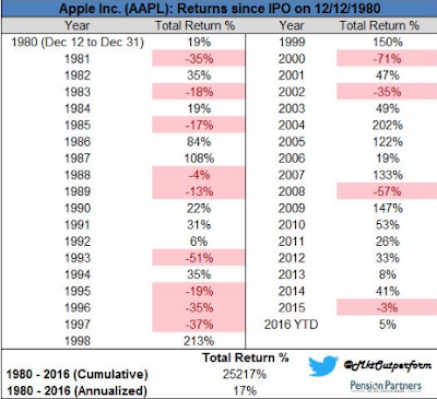 Apple is another great example, a $100k dollar investment in 1980 would’ve been worth $457,974 by 1992, then $224k in 1993 and $100,486 by 1997. All along one could’ve argued that Apple was a great company all those years.