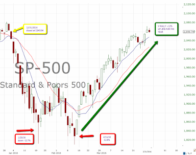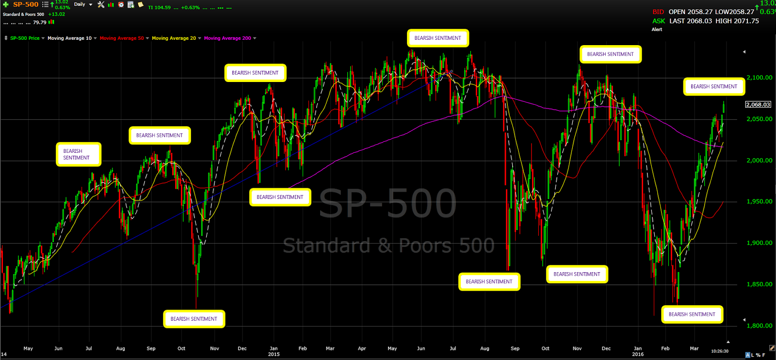 Depending on how you look at it, the 1st quarter was the most eventful and uneventful quarter in a while. The SP-500 lost -12.7% in the first 12 trading days. Sentiment was dreadful; RBC Dain advised their clients to sell everything, Soc Gen–“75% decline isn’t that crazy,” George Soros hinted that it could be 2008 all over again. On cue, the SP-500 rallied 7% in a few days just to lose -7% a week later that put the SP-500 down -12.8% by 2/11/16. On 2/12, we embarked in another V-rally in which the market grinded higher for 25 days virtually without any down days. These V-rallies have come immediately after steep pullbacks that were accompanied by “bad news”, this combination makes it really hard for many to believe that it is sustainable. Many finally capitulate weeks after, go long and strong, and suddenly point at the things that they consider bullish that can take the market even higher. The funny thing is those things that they deem bullish were in place when the market was down 12%, specifically sentiment.