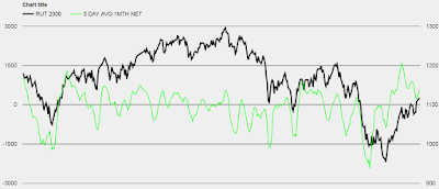 Here you have the Russell 2000 vs. the 5-day moving average of the net number of 1-month highs minus 1-month lows.
