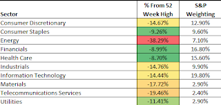 The stocks within every SP500 sector has had a significant pullback from their 52 week high while the index itself is still a stone throw away from its high. h/t Chad Gassaway.
