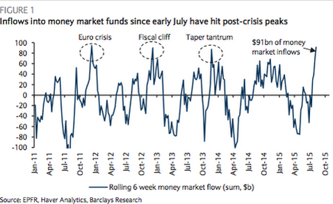The Dow Jones as I write this is down 232 points, people are freaking out, you can see that by the surge in inflows into money market funds.