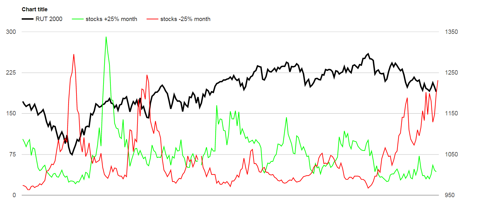 Stocks down 25% or more in the last month stands at 211, spikes above 200 have led to bounces.