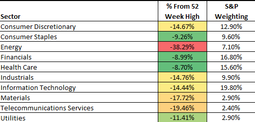 The stocks within every SP500 sector has had a significant pullback from their 52 week high while the index itself is still a stone throw away from its high. h/t Chad Gassaway.