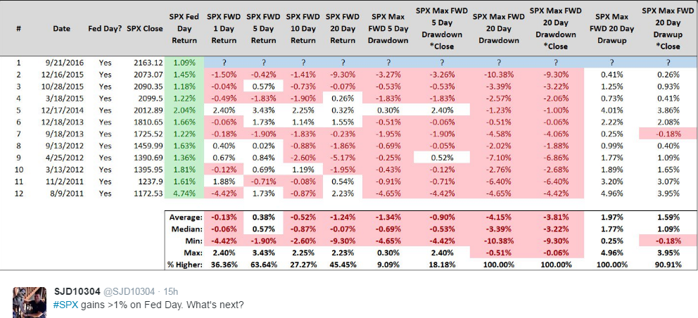 The Fed as expected did not raise rates; the market celebrated this event by gaining 1% on the day. As a matter of fact, mostly everything rallied including oil, metals, and bonds. Going forward this combination of gaining 1% and oil, metals, and bonds rallying after a Fed meeting has not been kind for future returns going out 10-20 days as you can see on the chart below. The initial pop was almost always retraced.