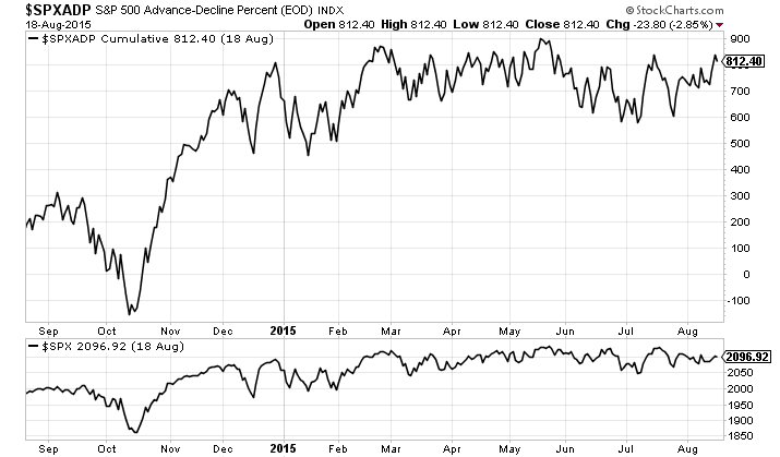 The bloggers are pointing out the chart below. Advance-Decline Percent is a breadth indicator that measures the percentage of Net Advances. AD Percent = (Advances Less Declines) / Total Issues. As you can see it is trading near highs chugging right along with SP500.