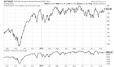 The bloggers are pointing out the chart below.  Advance-Decline Percent is a breadth indicator that measures the percentage of Net Advances.  AD Percent = (Advances Less Declines) / Total Issues.  As you can see it is trading near highs chugging right along with SP500.