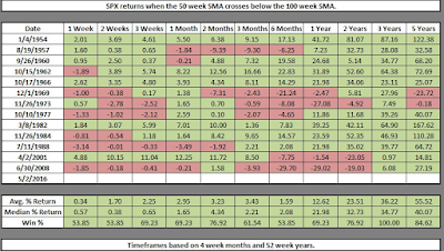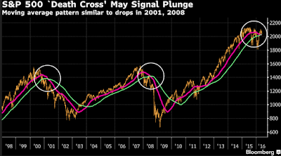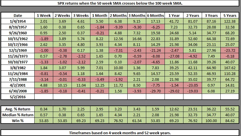 The chart shows two instances when one moving average crossed another moving average (50-week and 100-week) to the downside and coincidently the market went down big. The underlying assumption is that the death cross we are experiencing now will have the same effect. This is a great chart to get a lot of page views and to meet the daily blog quotas, but it means nothing at all. Two sample sizes are not enough to conclude anything. Secondly, you would have to believe that the 2001 and 2008 plunge was because of a cross of two moving averages and not because of the Internet craze and the housing bubble. Thirdly, if you went back to 1950 and calculated what happen every time this “death cross” has happened you will quickly see that there is no statistical edge to the downside at all.