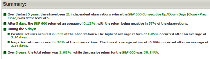 In the last five years, (up 5-days in a row) it has happened 21 times, the average final return five-day return has been +0.13%.