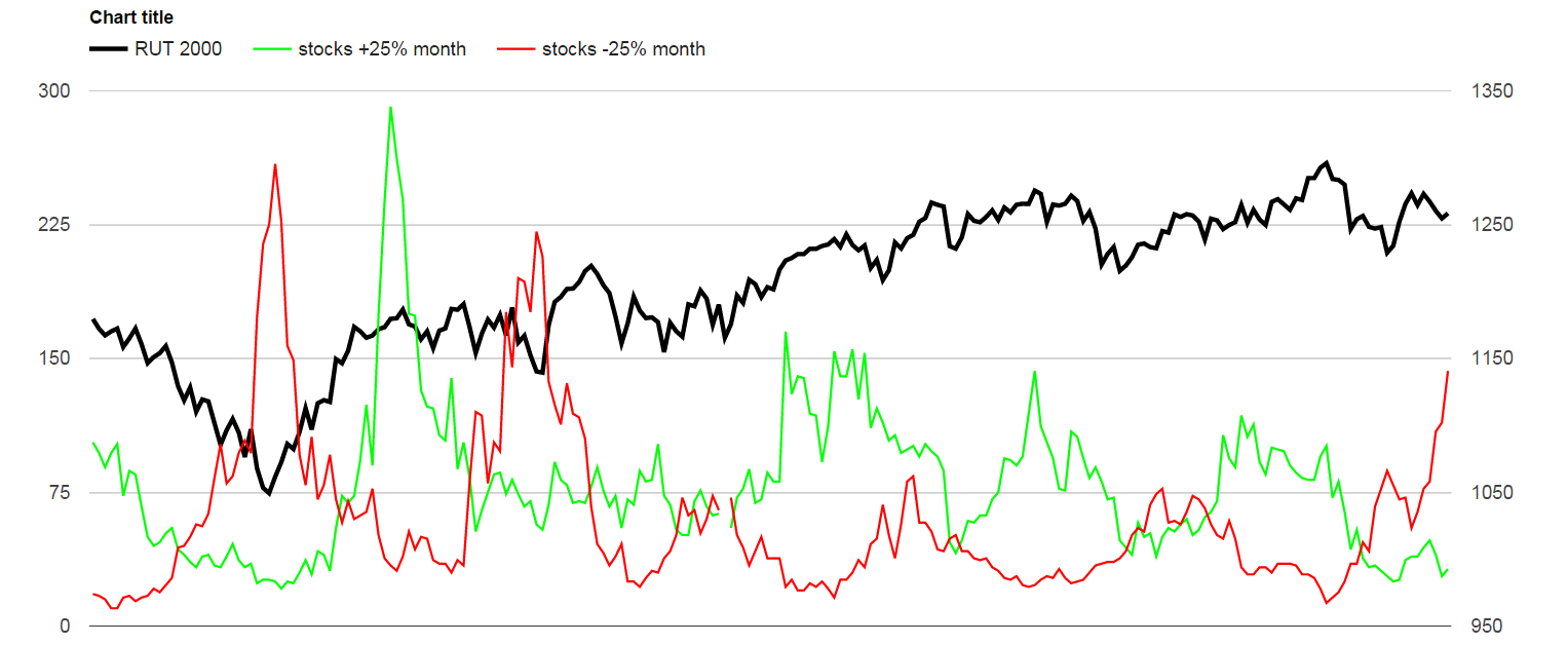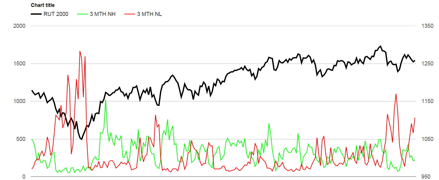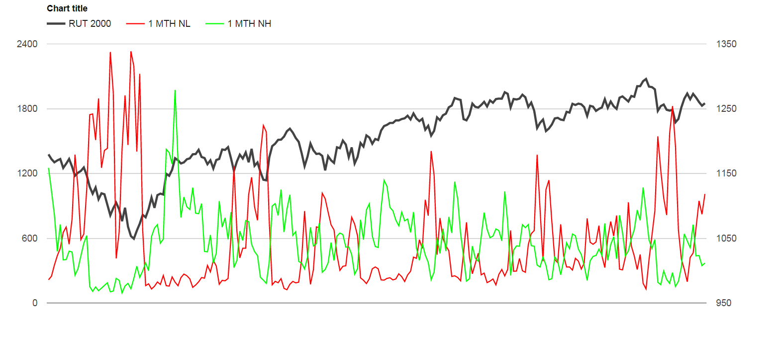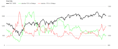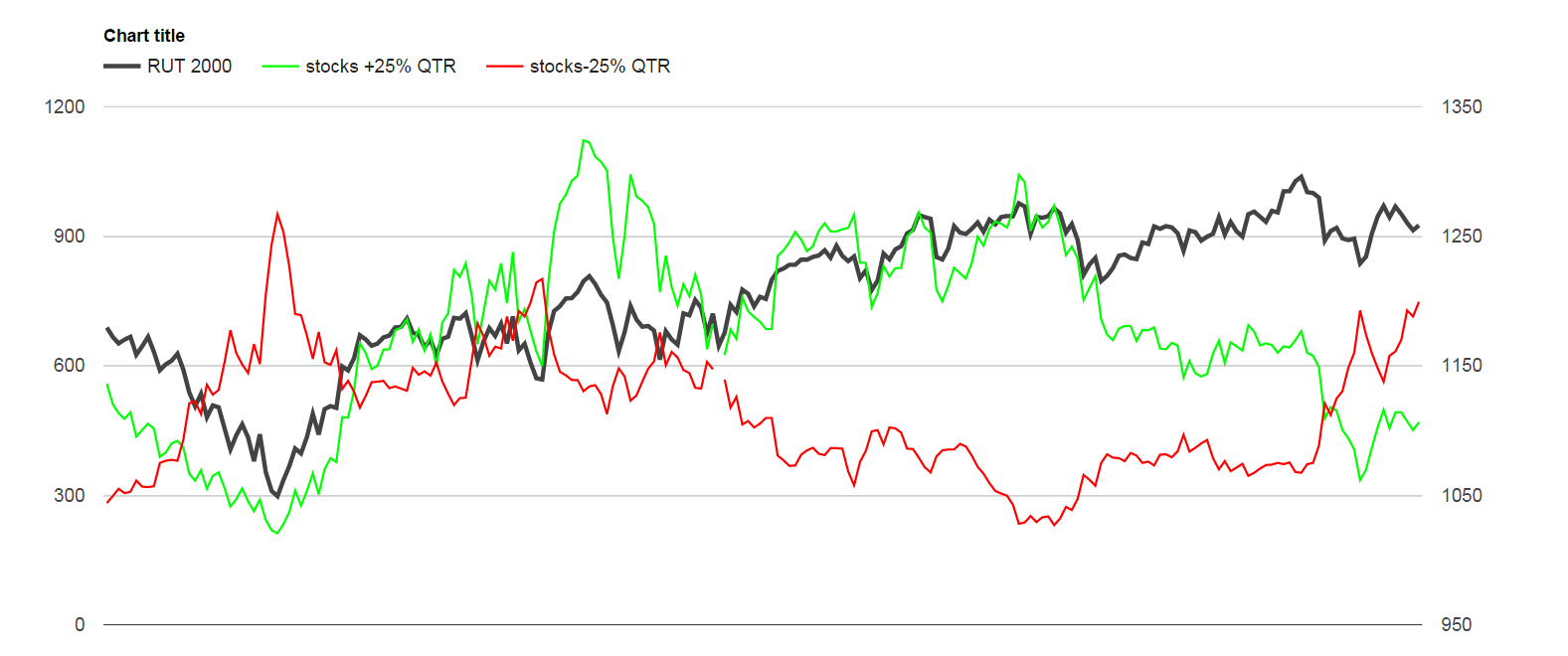 Here we have the Russell 2000 versus stocks up 25% or more for the quarter and stocks down 25% or more for the quarter. You can see that the amount of stocks down 25% or more for the quarter is rising steadily while stocks up 25% or more in the quarter is in a downtrend while the index sits near highs. (stockbee indicator).