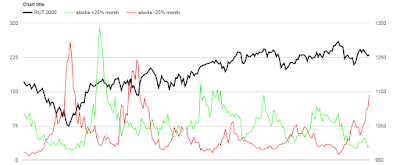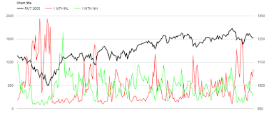 If we take the stats above and cut them in half; stocks up and down 13% or more in the last 34 days shows the same trend, weak getting weaker. (stockbee indicator).