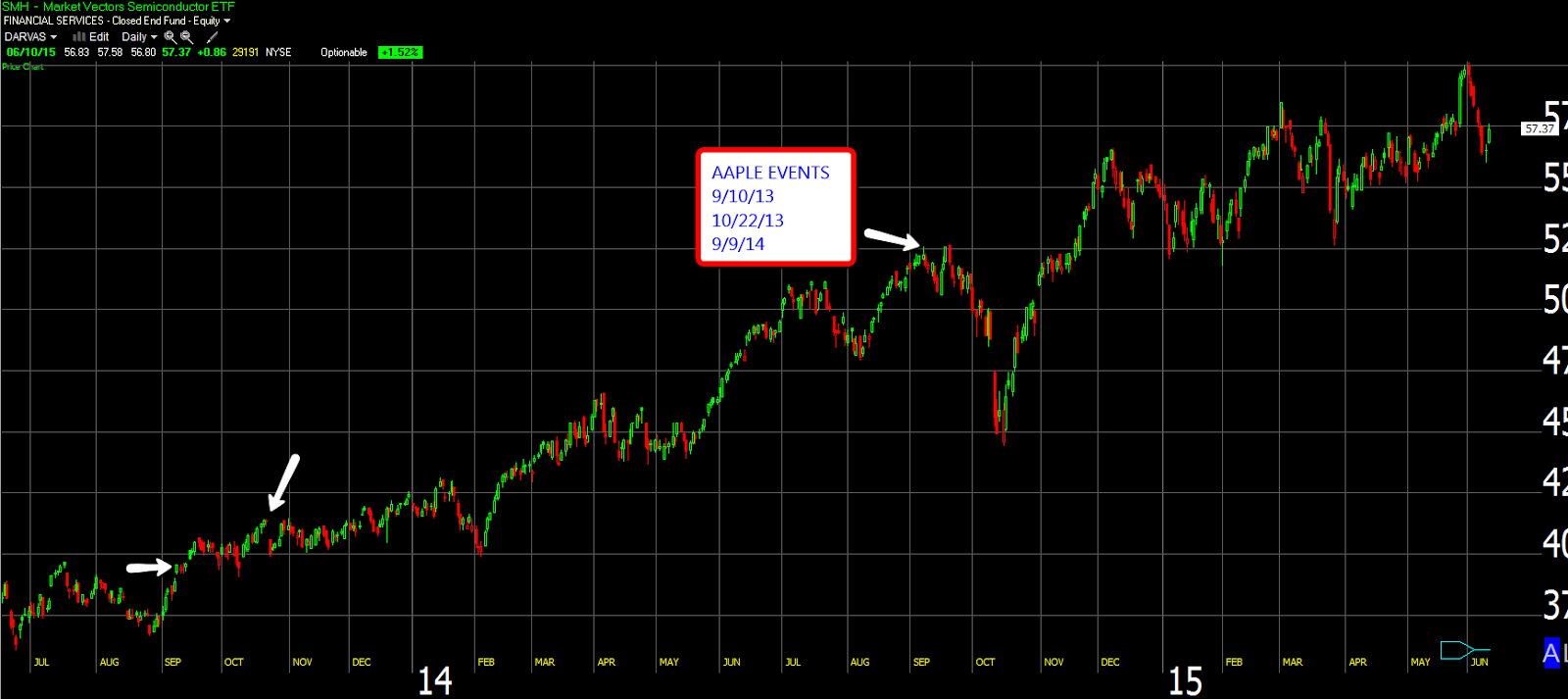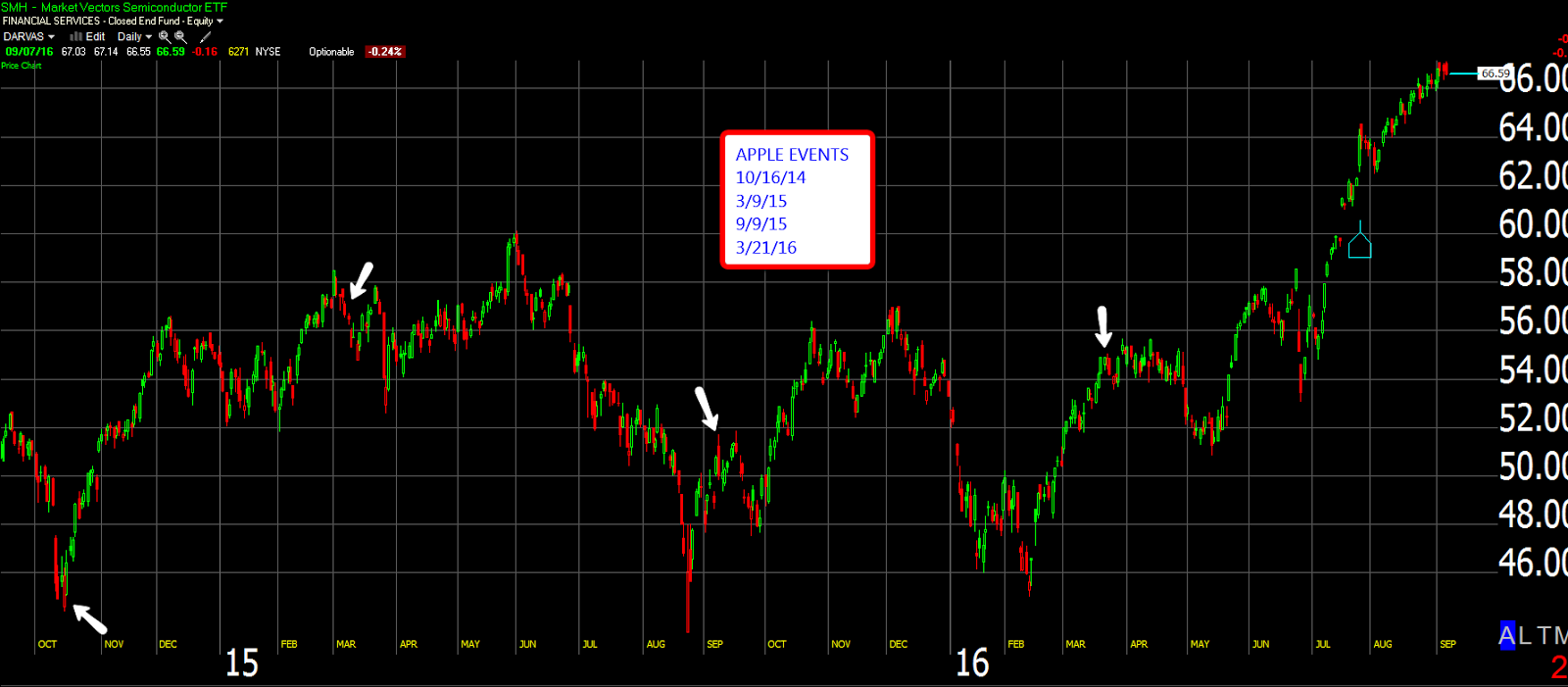 For informational purposes only I pinpointed the in Semiconductor ETF (SMH) chart the last 7 Apple events. Without forming too much of an opinion you can see that these events have for the most part changed the previous trend in the Semiconductor ETF in the very short term.