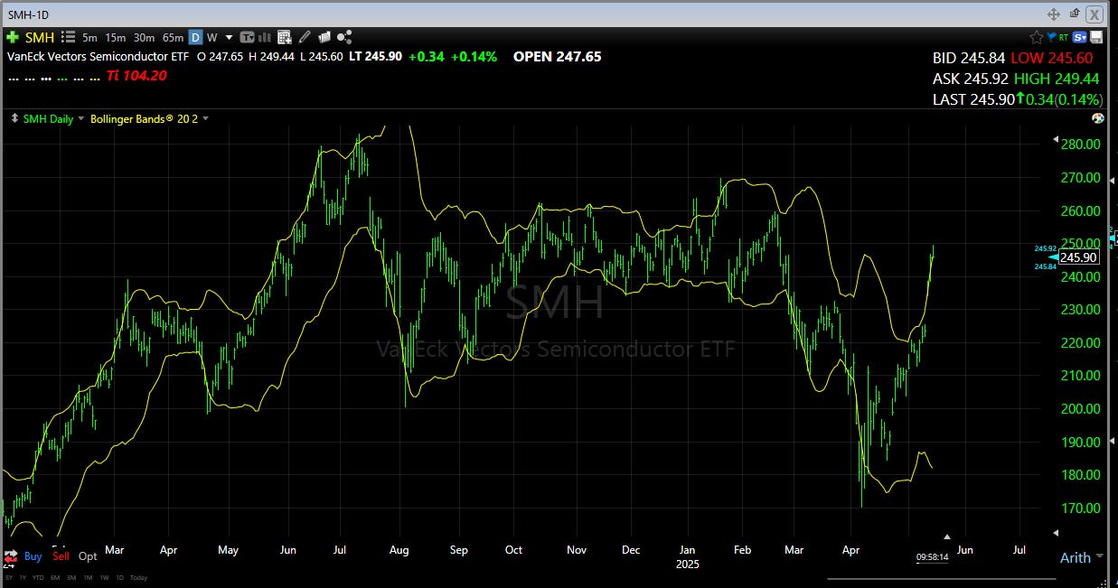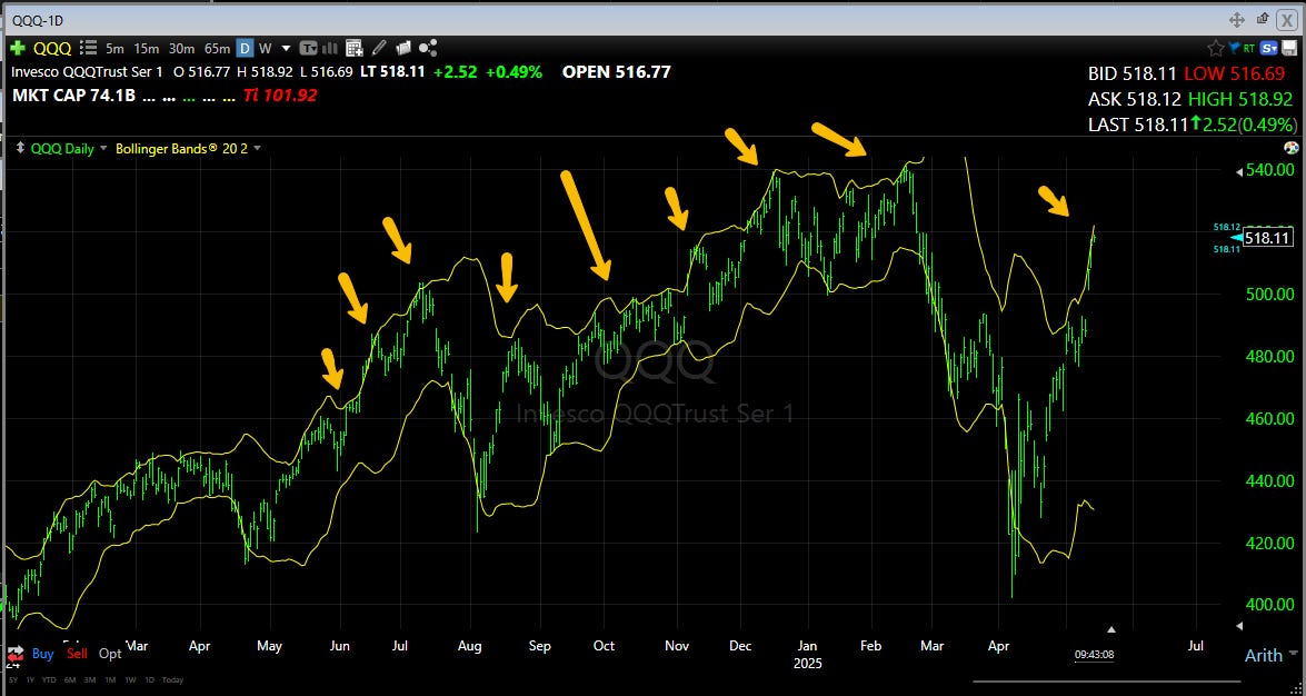 This morning, the QQQ tapped the top of its daily Bollinger Band. I usually don’t give it much weight—unless we’ve just had a sharp short-term expansion like we have now. That’s when it matters.