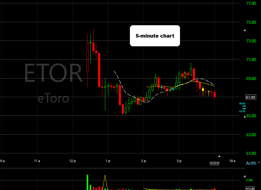 eToro $ETOR made a strong Nasdaq debut, opening at $69.69 after pricing its IPO at $52, raising nearly $310M and valuing the company at $5.6B. Shares surged as high as $74 intraday.