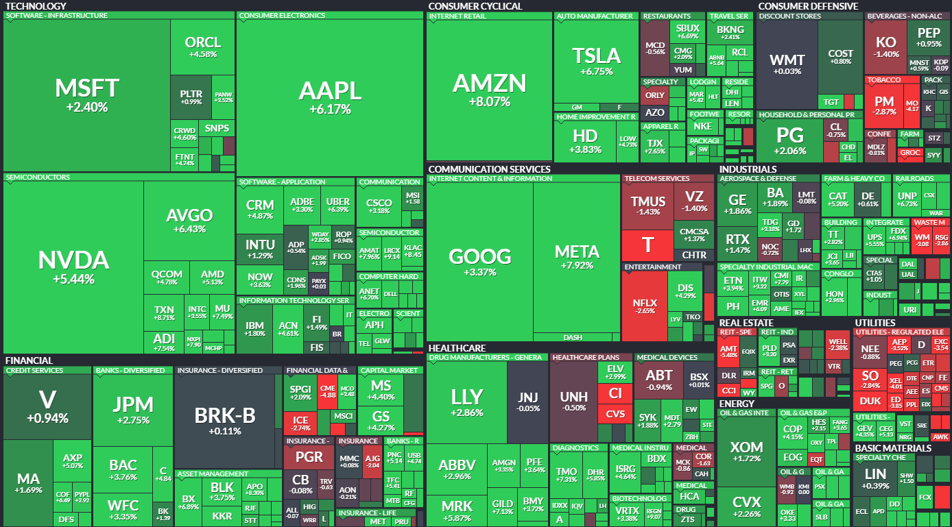 Tech and Consumer Discretionary Rally: Major tech stocks like Apple (+6.2%), Nvidia (+4.7%), and Tesla (+7%) led gains. Consumer discretionary stocks rose 5.5%, with companies like Amazon and Nike posting significant increases.
