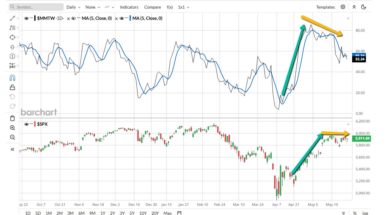 On April 9, breadth flipped positive above its 5-day moving average and remained there until May 6.
