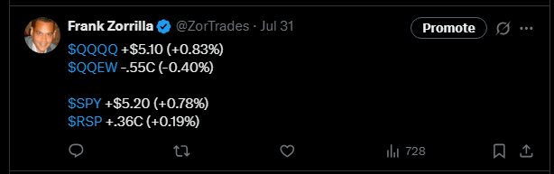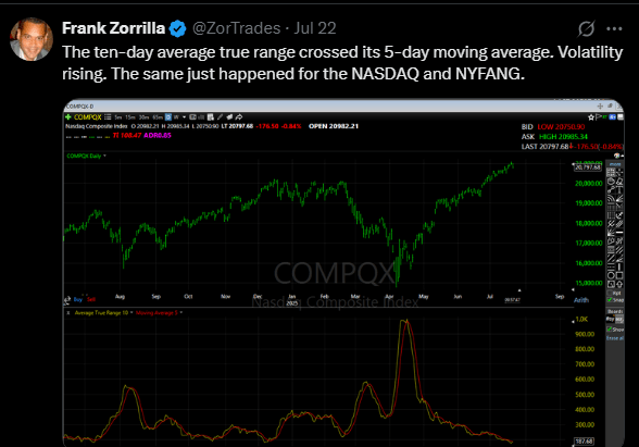 By July 22nd, something subtle but important happened: the 10-day average true range (ATR) on the Nasdaq crossed above its 5-day moving average — a signal that volatility was rising across key indices like the NASDAQ, NYFANG, and eventually SPY/QQQ as well.