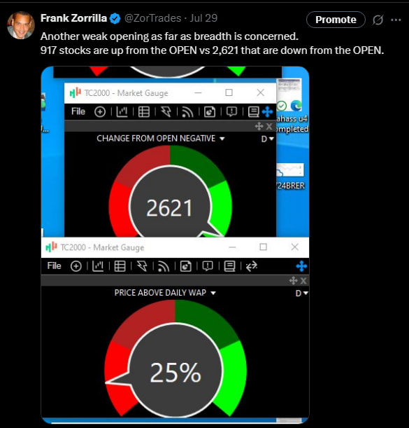 As the week progressed, breadth fell off a cliff. On July 29th, more than 2,600 stocks opened lower, and only 25% of stocks were trading above their VWAP. The surface looked calm, but underneath, it was leaking everywhere.