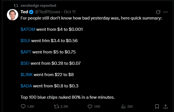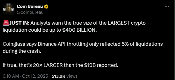 The crypto break wasn’t just sharp — it was record-setting. Roughly $19 billion in positions were liquidated within hours, and deeper analysis suggests the true total approached $400 billion.