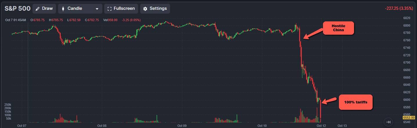 • SP500 broke at 11:00 AM and further declined after the close, following Trump’s imposition of 100% tariffs on China.