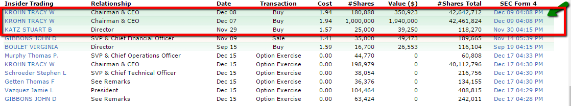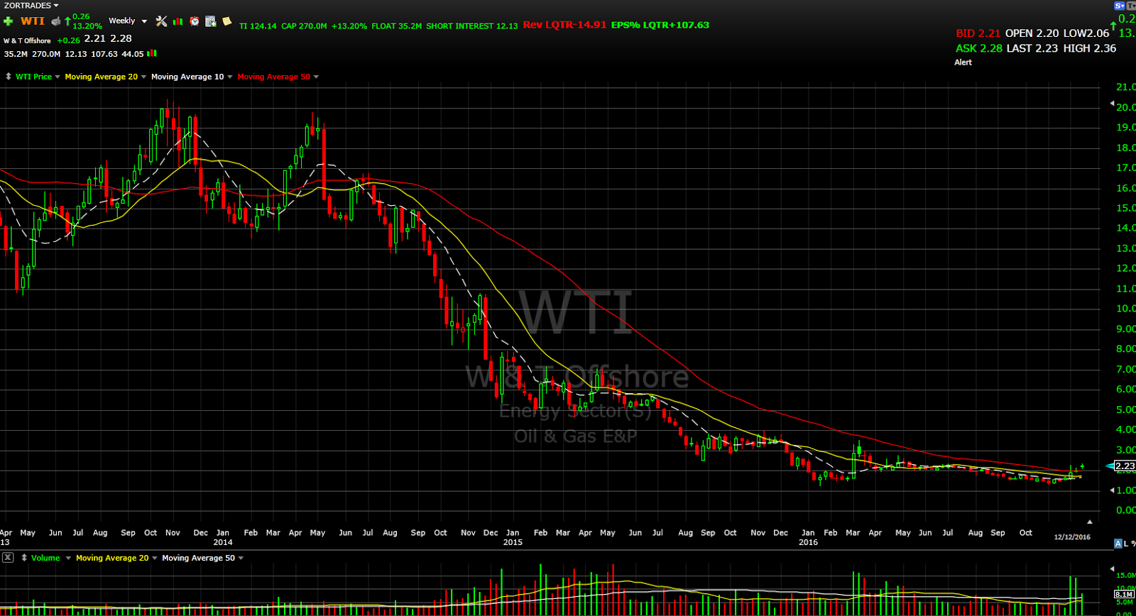 What’s interesting about the stock at this very moment is not only the fact oil is surging higher due to the recent Opec deal in which W&T could be a major benefactor. But, it’s the recent insider buy by the Chairman & CEO Tracy Krohn. On December 7 (last week) Tracy bought 1,000,000 of WTI at $1.94, on December 8th he bought 180,888 shares also at $1.94 bringing the amount of shares that he owns in a total to 42,642,712 shares.